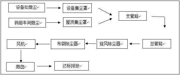 鎢鉬生產(chǎn)車間現(xiàn)有燒結(jié)設(shè)備、壓料設(shè)備、軋制設(shè)備共計(jì)5臺(tái)設(shè)備,正常作業(yè)為先從燒結(jié)設(shè)備取出板料,在通過(guò)壓料或者軋制設(shè)備加工。在取出板料的瞬間及運(yùn)送到壓料或者軋制設(shè)備期間有大量的煙塵產(chǎn)生;板料在壓料或者軋制加工過(guò)程中也會(huì)有煙塵產(chǎn)生。
